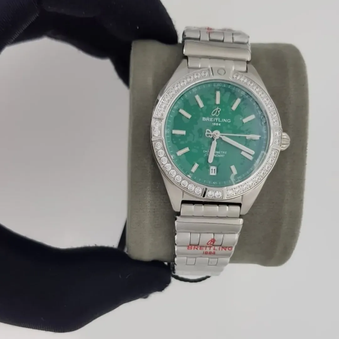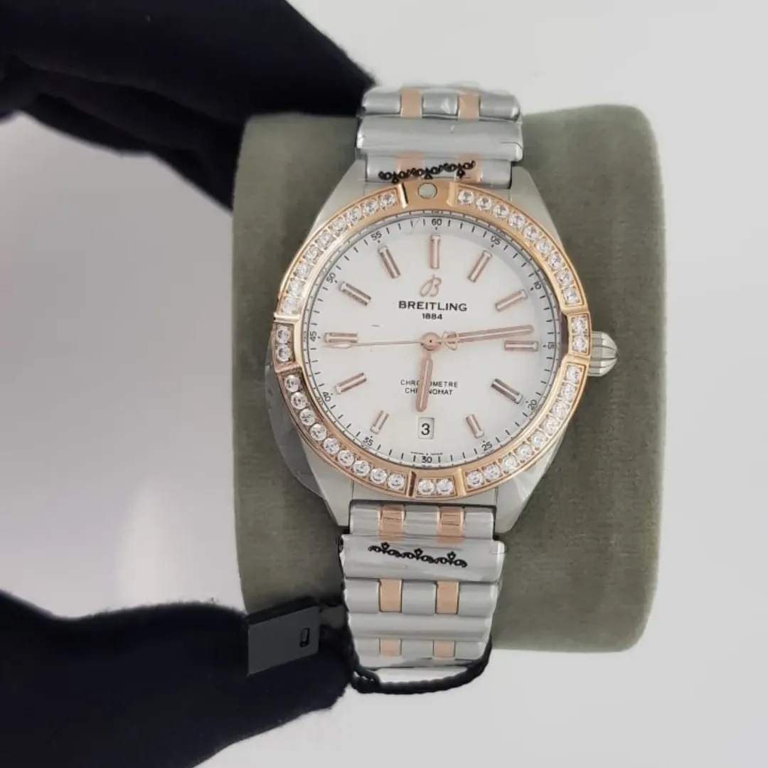 ساعت فلزی زنانه برند برایتلینگ با بند استیل و دور قاب نگین دار و تقویم دار. کیفیت تمام ساعت ها درجهیک می باشد.